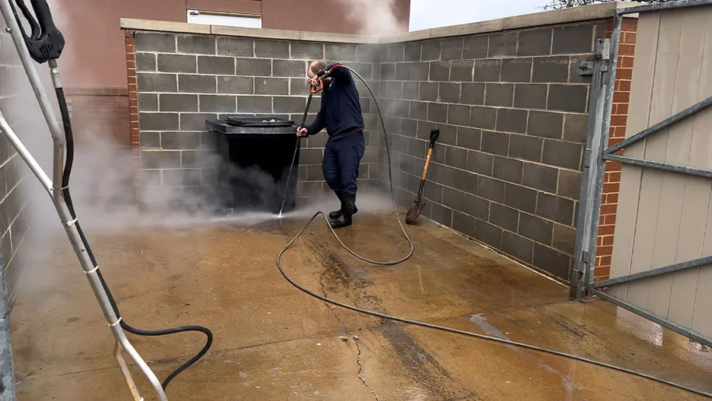 Yes. We use professional equipment designed for commercial concrete and exterior areas.