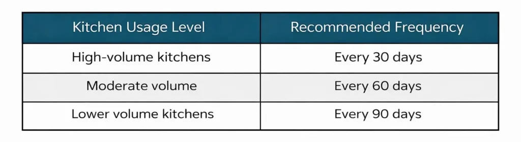 Typically every 30, 60, or 90 days, depending on kitchen volume and grease output.
